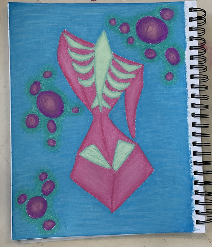 While originally working previously on artistic renderings of the human torso, Audrey decided to use a more realistic approach, using the typical beiges and tans of a human complexion. However, the more she worked on the piece, the less connected she felt to it. Audrey described the original process as “just not fun to work with: It was simply not eye-catching to work with brown and muddy colors.” Consequently, Audrey decided to revise the piece, creating something completely new; something she felt she connected with.