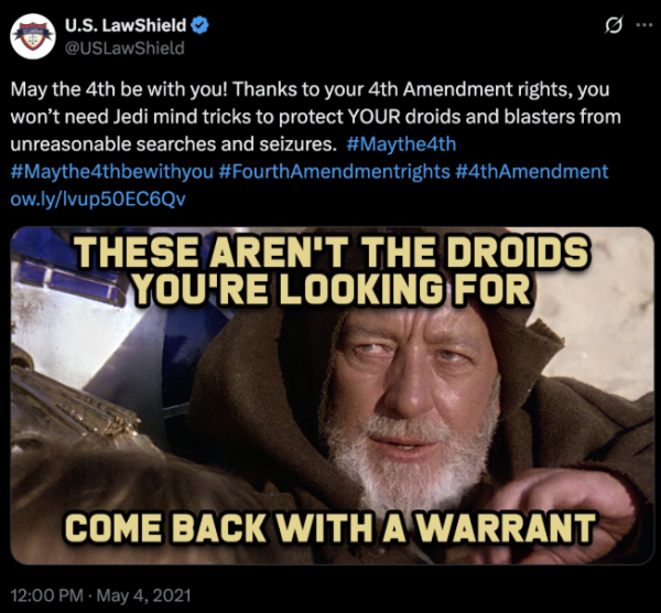 On May 4th, 2021, the U.S. Law Shield tweeted, “May the 4th be with you! Thanks to your Fourth Amendment rights, you won’t need Jedi mind tricks to protect YOUR droids and blasters from unreasonable searches and seizures.” Wait, what exactly are those Fourth Amendment rights?