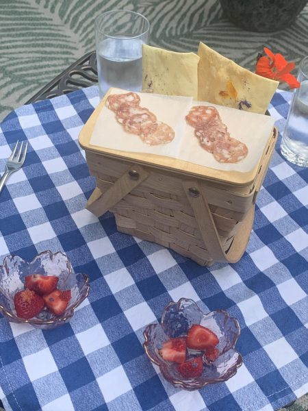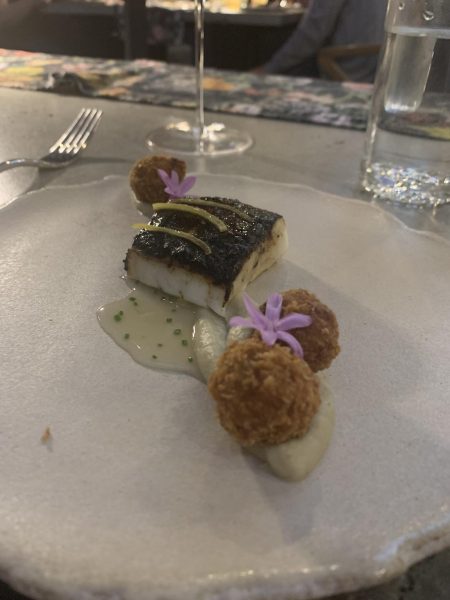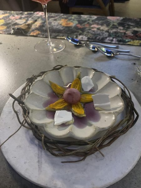 The first three appetizers each explored a different interpretation of the flower-based concept. The first dish was inspired by the traditional spring picnic, twisting the ideas of the typical picnic sandwich and jams. The first component was a flatbread seasoned with lavender salt, topped with prosciutto and a fennel-lavender fondue that was very simple and savory, the standout being the cheese—thick, creamy, and reminiscent of hummus. This was served alongside strawberries and crystallized violets, which were very sweet to combat all of the other extremely savory flavors and tasted similar to jam. The third component was asparagus with a puff pastry exterior served with green goddess sauce, which elevated the vegetable above being just cooked asparagus when the crunchy outside was dipped into the thick sauce, allowing the ingredients to work together.