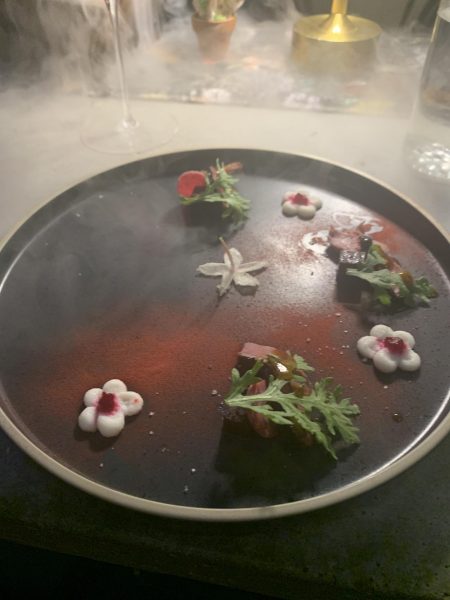 The third dish was centered on an Alpine Meadow with a bed of hummus with locally sourced wild flowers and three cauliflower preparations—kimchi, tempura, and candied—served atop a rock to mimic a field that is by a mountainside. I’m not a fan of cauliflower, but the texture worked well with the hummus while also remaining very light with the lemon from the hummus keeping the dish from becoming too rich. This dish was my personal favorite of the night.