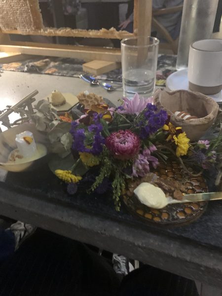 The second dessert came with a large honey comb decoration as a tribute to the bees while the actual dish was made up of chamomile gelato, a truffle made with bee’s wax instead of honey, a waffle with additional fruits, merengue in a sauce with toffee barley, and mascarpone cheese with honey comb. Each component contributed different textures and levels of sweetness to the dish which was cut through by the savory notes of the mascarpone cheese.