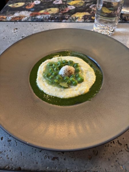 The second dish was a play on risotto with a focus on peas. The dish is constructed with a thin layer of pea sauce at the edge, then a layer of grits, and at the center of the bullseye were the peas and a quail egg. Both textures from the grits and the texture from the peas complemented the silky textures of the outer sauce and the quail egg, unifying the dish through the contrasting textures while also letting the saltiness of the green sauce not overpower the dish.